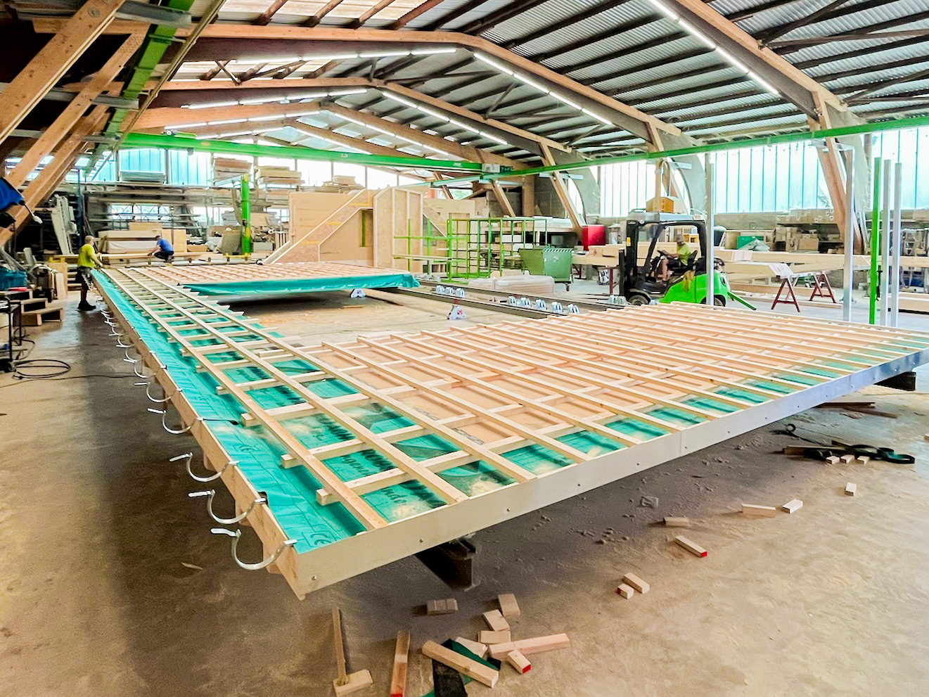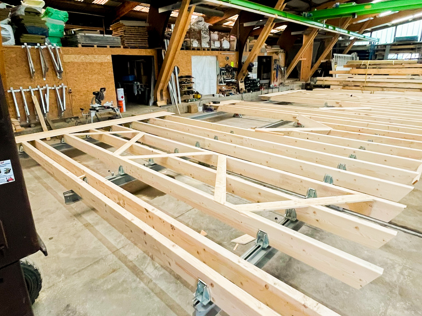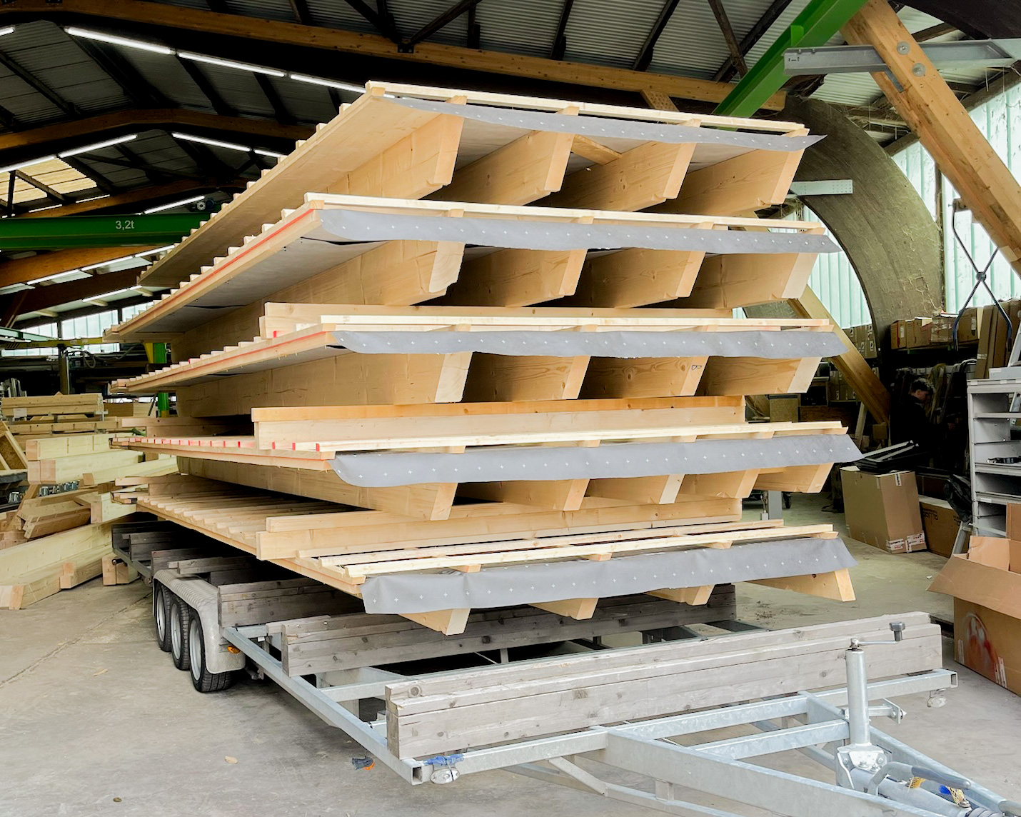 Wir vereinfachen den klassischen Zimmermanns- und Dachdeckerablauf, indem wir Dächer nicht wie üblich komplett auf der Baustelle von Grund auf montieren, sondern so viele Arbeitsschritte wie möglich in unserer Halle vorfertigen.
