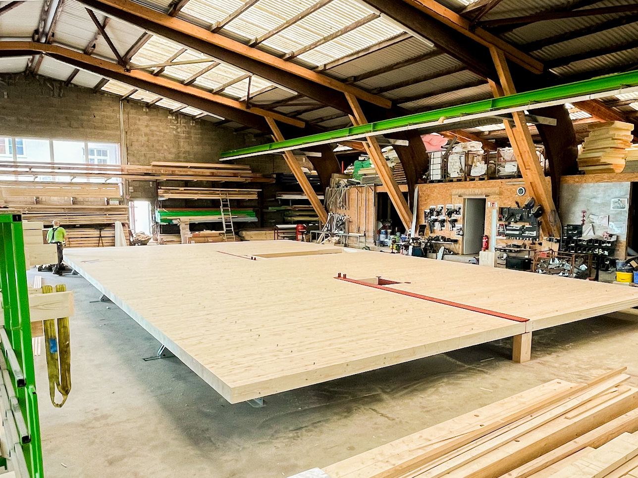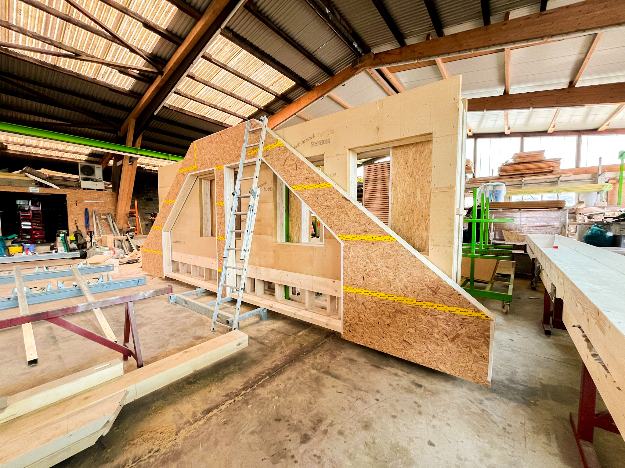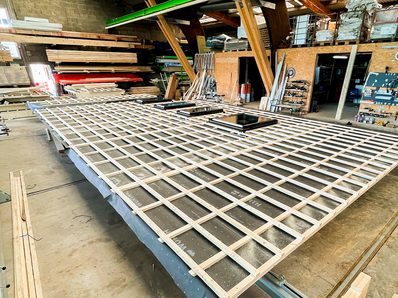 Wir vereinfachen den klassischen Zimmermanns- und Dachdeckerablauf, indem wir Dächer nicht wie üblich komplett auf der Baustelle von Grund auf montieren, sondern so viele Arbeitsschritte wie möglich in unserer Halle vorfertigen.